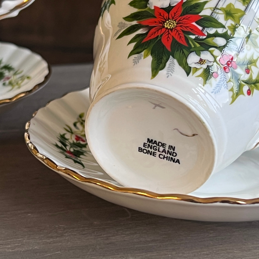 Angliško porceliano puodelis žvakė, dekoruotas kalėdiniais simboliais