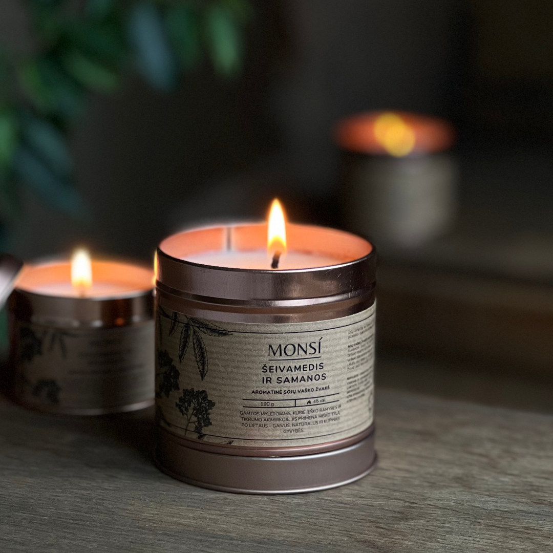 Aromatinė sojų vaško žvakė metaliniame indelyje – Tobula namams, dovanai ir kelionėms